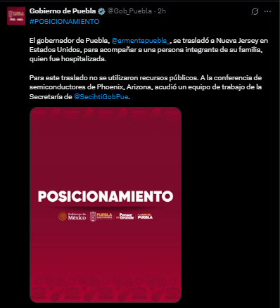 El gobernador Alejandro Armenta aclaró en un mensaje en redes sociales que se trasladó a Nueva Jersey en Estados Unidos, para acompañar a una persona integrante de su familia, quien fue hospitalizada. En un comunicado para fijar su posición, explicó que “para este traslado no se utilizaron recursos públicos”.