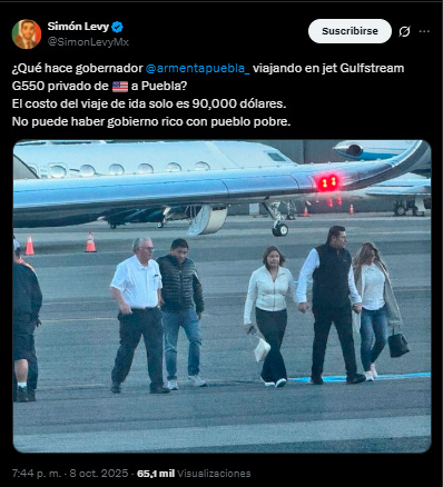 “Qué hace gobernador @armentapuebla_ viajando en jet Gulfstream G550 privado de 🇺🇸 a Puebla?”