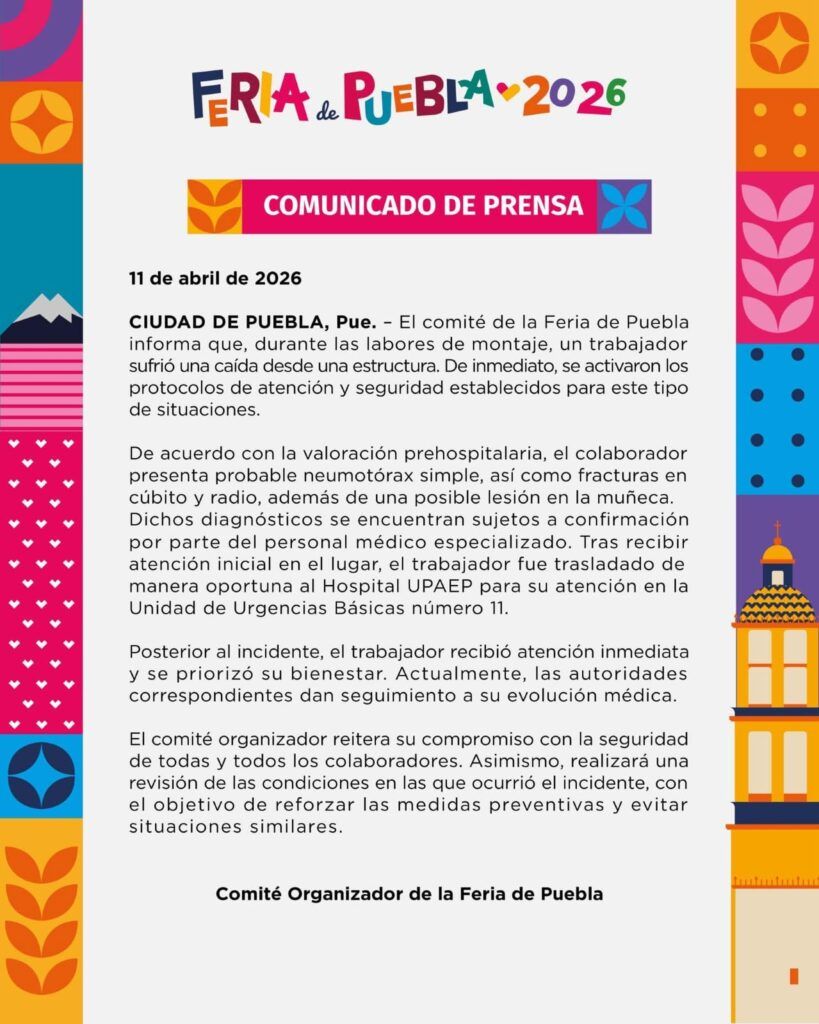 Un accidente durante los preparativos de la Feria de Puebla 2026 dejó a un trabajador hospitalizado, luego de que cayera desde una estructura mientras se llevaban a cabo las labores de montaje. El hecho ocurrió este 11 de abril en la capital poblana, donde equipos de emergencia intervinieron de inmediato tras activarse los protocolos de seguridad en el área.