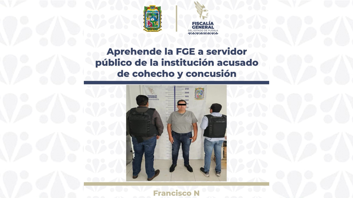 Por su probable responsabilidad en la comisión de los delitos de cohecho y concusión, la Fiscalía General del Estado dio cumplimiento a la orden de aprehensión en contra de Francisco N., quien se desempeñaba como agente del Ministerio Público de la Fiscalía Especializada en Investigación de los Delitos de Desaparición Forzada de Personas y Desaparición Cometida por Particulares.