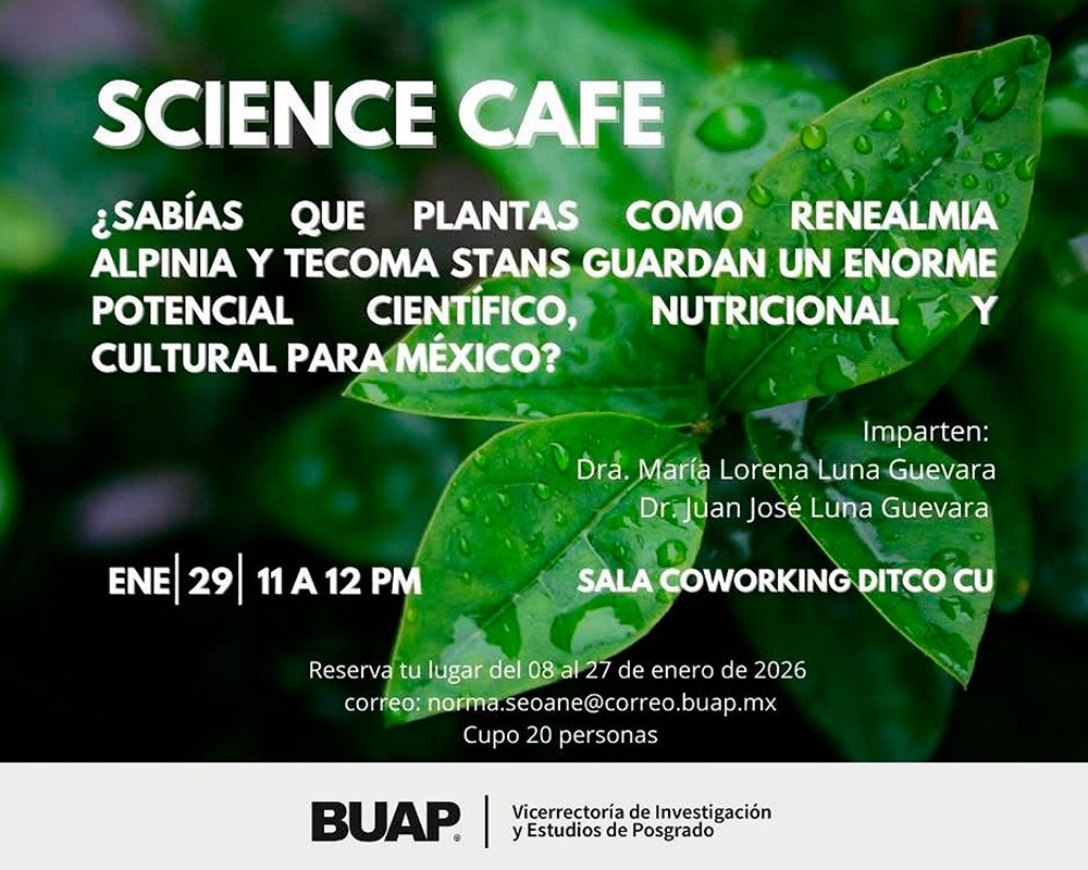 Con el objetivo de acercar la ciencia a la comunidad universitaria y al público en general, la Benemérita Universidad Autónoma de Puebla (BUAP) llevará a cabo el Café Científico, un espacio de diálogo abierto que se realizará el próximo viernes 29 de enero, de 11:00 a 12:00 horas, en la Sala Coworking de la Dirección de Innovación y Transferencia de Conocimiento (DITCo).