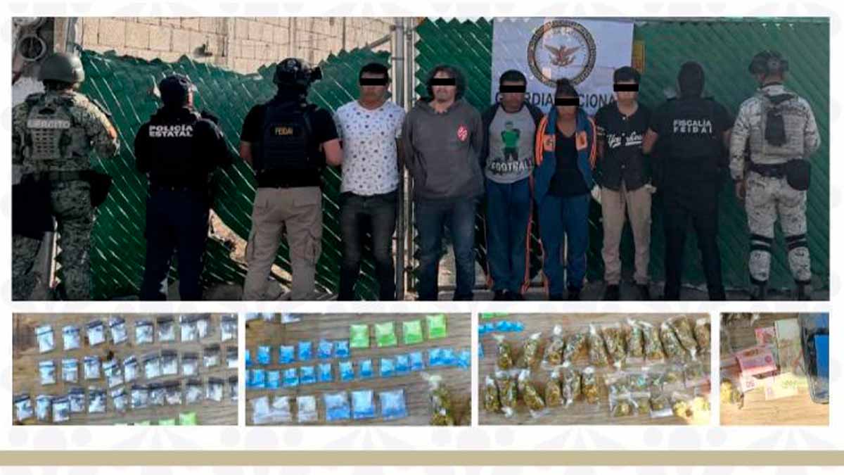 Durante la diligencia, fueron detenidos Juan N., Juan José N., José N., Daniel N., Miguel N. y Guadalupe N., en posesión de 61 envoltorios con sustancia granulada de color blanco con características similares al narcótico conocido como cristal, 29 envoltorios con hierba verde con características propias de la marihuana y dinero en efectivo.