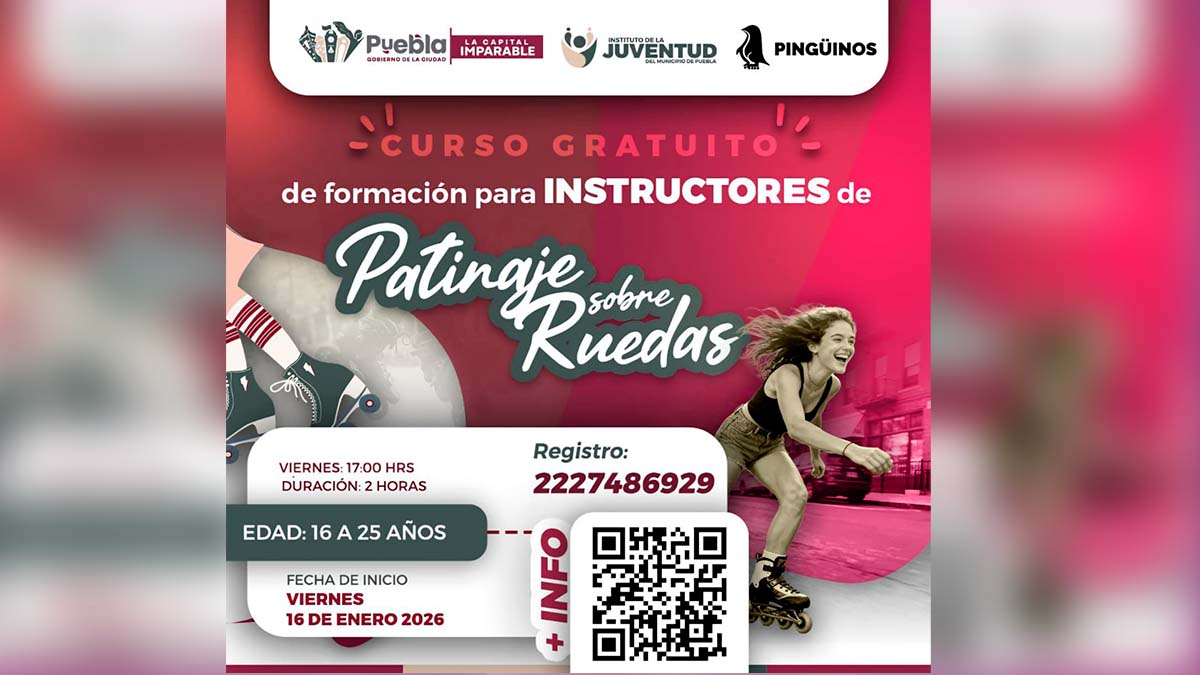 Bajo la dirección de su titular, Carolina Cabrera Victoria, el IJMP, en coordinación con el Grupo de Patinaje Recreativo Pingüinos, realiza este curso dirigido a personas de entre 16 y 25 años de edad, residentes de la ciudad de Puebla. A lo largo de seis meses de formación, las y los participantes recibirán capacitación teórica y práctica en técnicas de patinaje, metodología de enseñanza, seguridad, inclusión, liderazgo, trabajo en equipo y desarrollo humano.