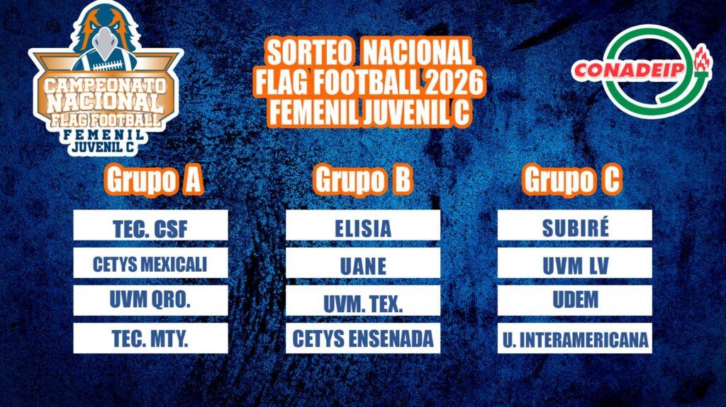 Este lunes, en la Aula Magna de la Universidad Interamericana, se llevó a cabo el sorteo de grupos para el Campeonato Nacional de Flag Football en la rama femenil, categoría Juvenil C, el cual se celebrará del 13 al 15 de abril en el campo de pasto sintético de nuestra institución.