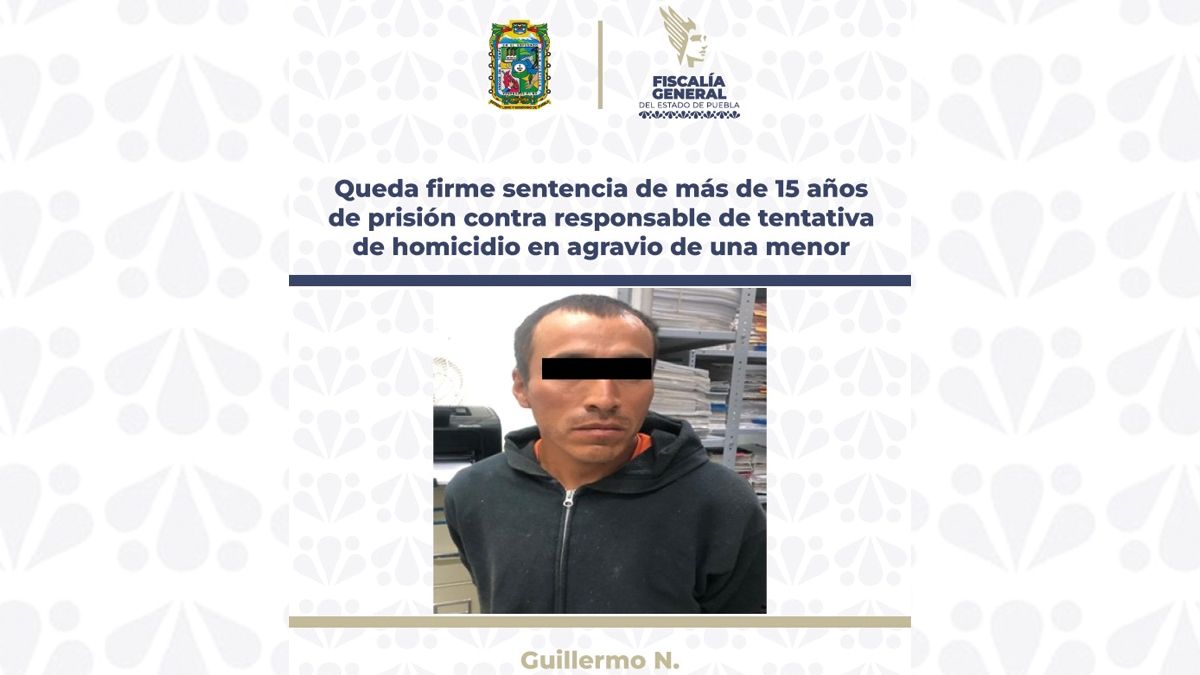 La Fiscalía General del Estado logró mediante la aportación de diversos datos de prueba, que quedara firme la sentencia de más de 15 años de prisión, en contra de Guillermo N., penalmente responsable del delito de homicidio en grado de tentativa, en agravio de una menor de edad, ocurrido en la ciudad de Puebla.