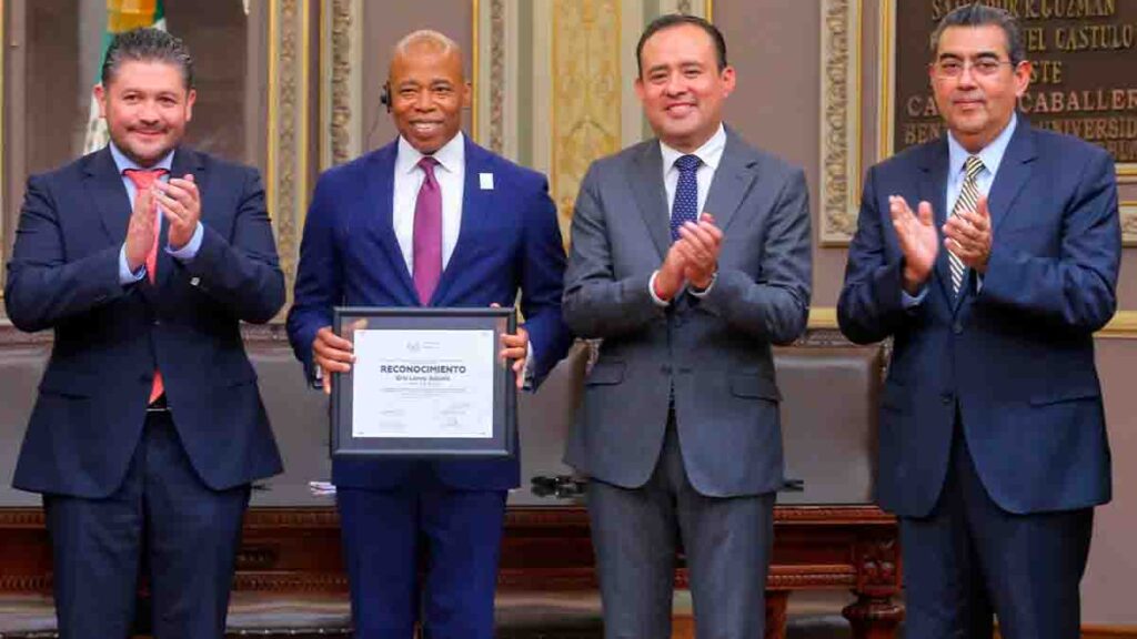 En el Congreso del Estado, el gobernador Sergio Salomón Céspedes Peregrina presidió la entrega de una distinción a Eric Leroy Adams quien refrendó que su gestión es compañera y amiga de las y los migrantes